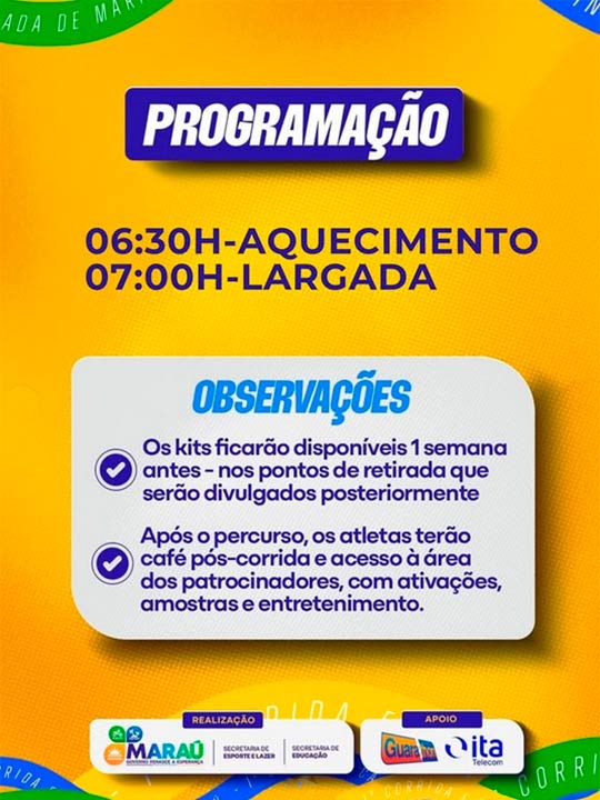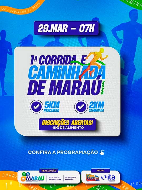 Vem aí a 1ª Corrida e Caminhada de Maraú, um evento feito pra quem ama esporte, saúde, superação e boa energia! 29 de março, 07h da manhã, Maraú. Escolha o seu ritmo e participe: 5KM – percurso oficial da corrida, 2KM – caminhada para todas as idades. Além de movimentar o corpo, você ainda participa de uma ação solidária: Inscrição: 1kg de alimento.