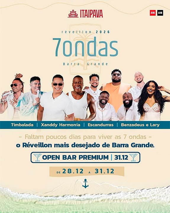 Réveillon 7 Ondas Barra Grande. Celebre o instante. 28, 29, 30 e 31 de Dezembro. Dia 31 é Open Bar! Na Praia de Barra Grande e traz uma line única. Vem viver essa experiência mágica! Prepare-se para uma virada de ano inesquecível! Com Timbalada, Xandy Harmonia, Escandurras, Benzadeus e Lary.