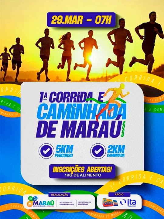 Vem aí a 1ª Corrida e Caminhada de Maraú, um evento feito pra quem ama esporte, saúde, superação e boa energia! 29 de março, 07h da manhã, Maraú. Escolha o seu ritmo e participe: 5KM – percurso oficial da corrida, 2KM – caminhada para todas as idades. Além de movimentar o corpo, você ainda participa de uma ação solidária: Inscrição: 1kg de alimento.